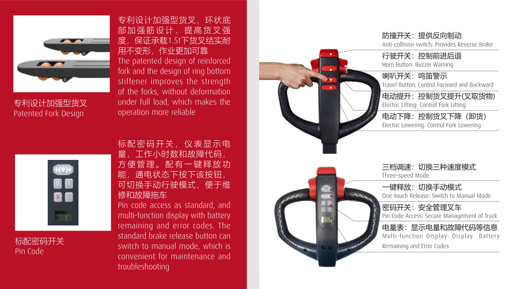 低位安装的长舵柄保证叉车与驾驶人员之间足够的安全距离,当叉车15分钟未使用时,自动进入休眠模式,避免车辆闲置时发生其他意外,减少能耗