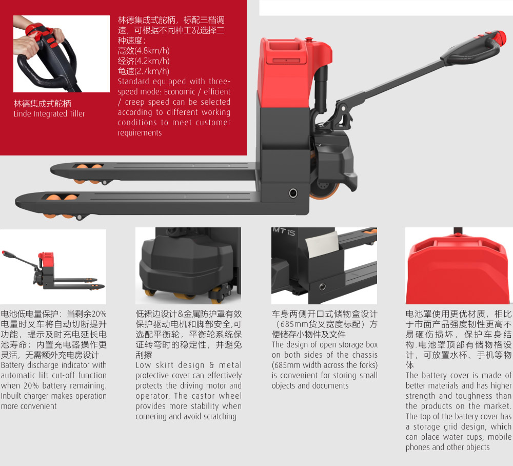 符合人机工程的林德舵柄设计, 驾驶更加舒适,紧凑的车身设计,即使在狭窄的空间也能实现轻松、精确的控制